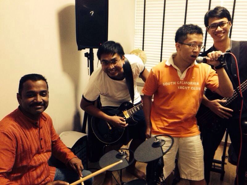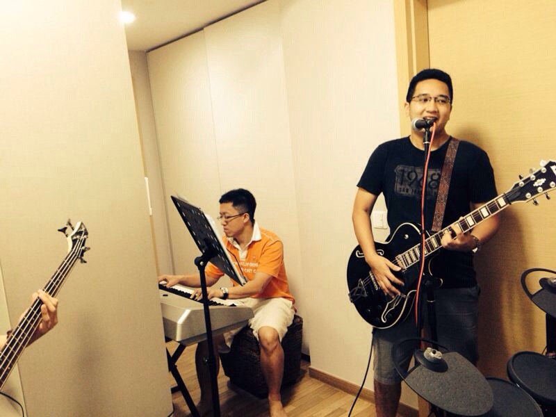 All plugged into Fender Passport 300 Pro – Yamaha DGX, Shure SM58+TC Helicon H1, Ibanez AGR70+Zoom G3x, and Yamaha DTX430K.